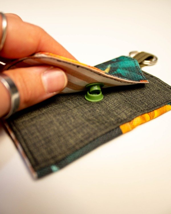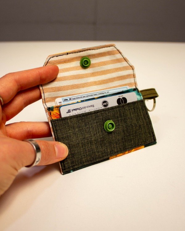 Este producto de confección artesanal está hecho con tela cordura resistente, tiene 2 bolsillos para tarjetas y documentos y se puede colgar en tus llaves como llavero. Si no usas billetera este tarjetero es ideal para vos, podés pones el documento, el carnet de conducir, las tarjetas y listo.
