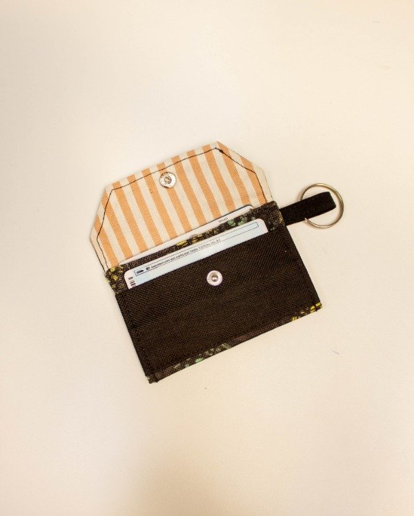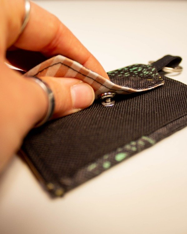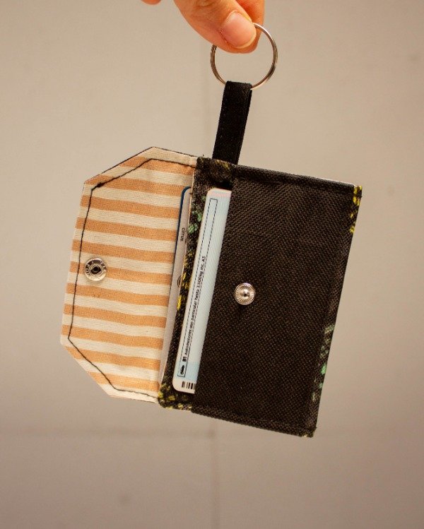 Este producto de confección artesanal está hecho con tela cordura resistente, tiene 2 bolsillos para tarjetas y documentos y se puede colgar en tus llaves como llavero. Si no usas billetera este tarjetero es ideal para vos, podés pones el documento, el carnet de conducir, las tarjetas y listo.