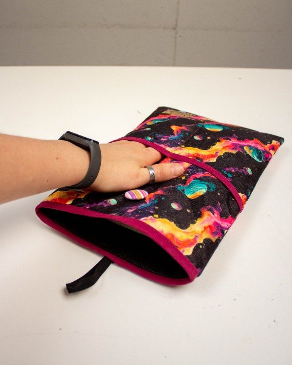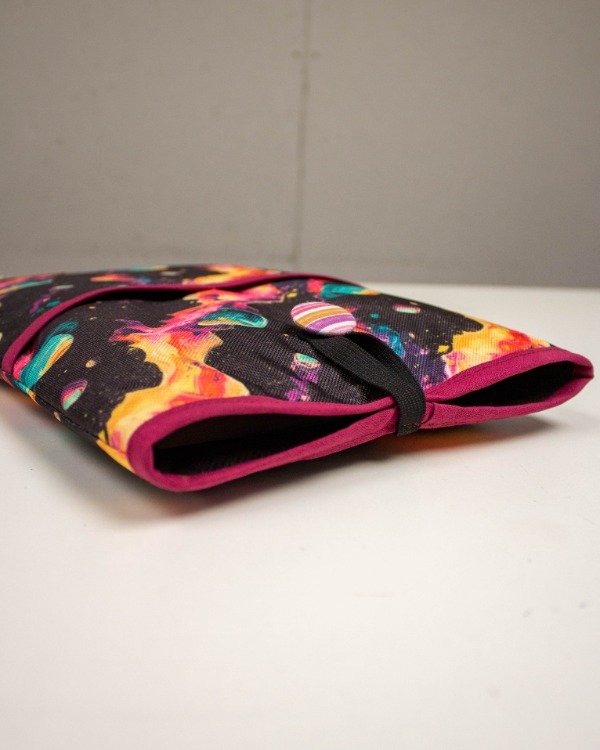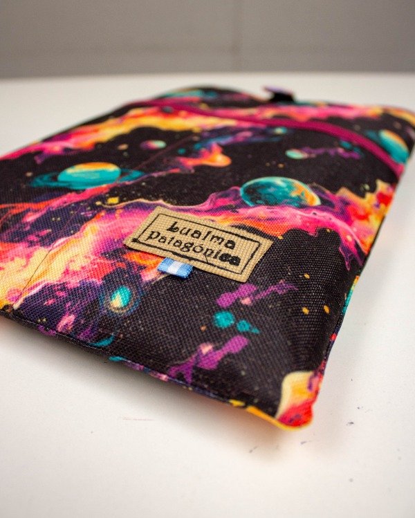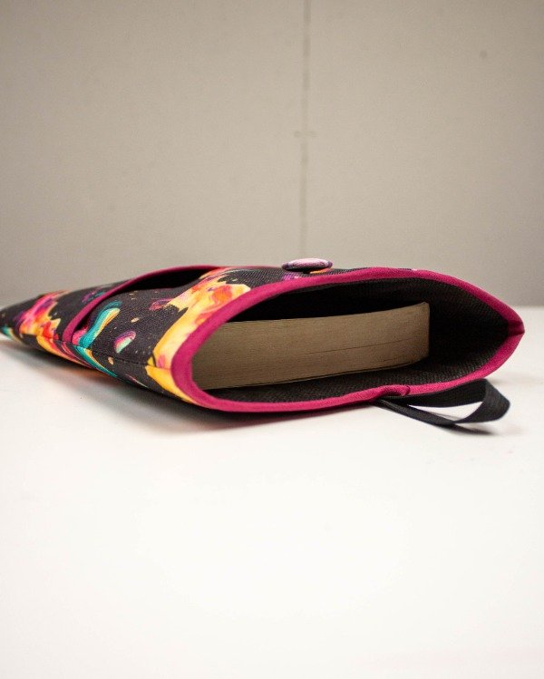Está funda de libro está hecha con tela cordura y forrada, además tiene polex en su interior para hacerla acolchada y que el libro esté protegido. Tiene 2 bolsillos en el frente y se cierra con un elástico que engancha en un botón.