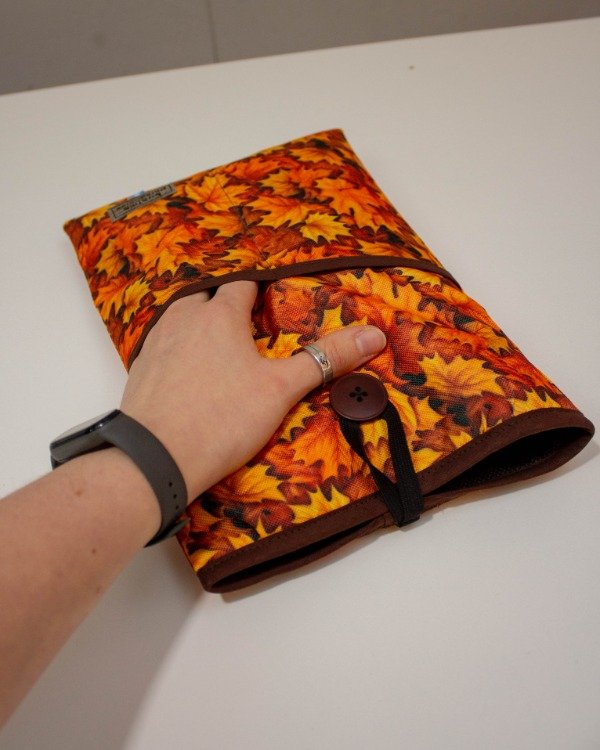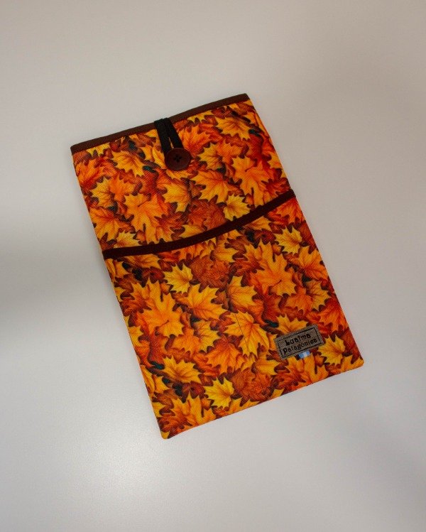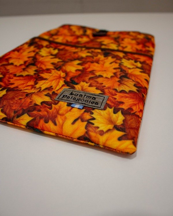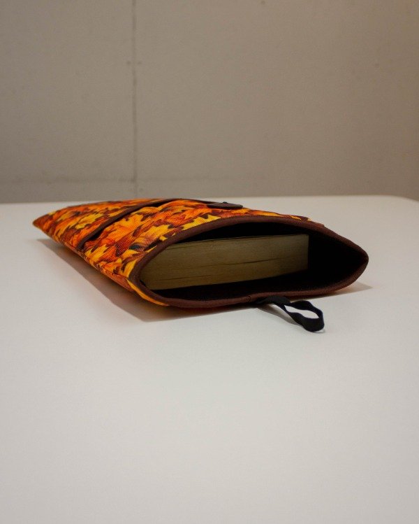 Está funda de libro está hecha con tela cordura y forrada, además tiene polex en su interior para hacerla acolchada y que el libro esté protegido. Tiene 2 bolsillos en el frente y se cierra con un elástico que engancha en un botón.