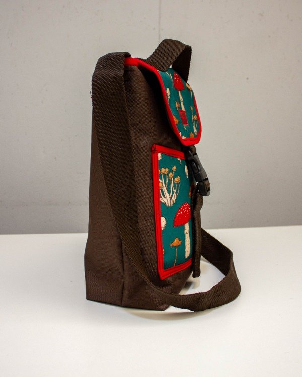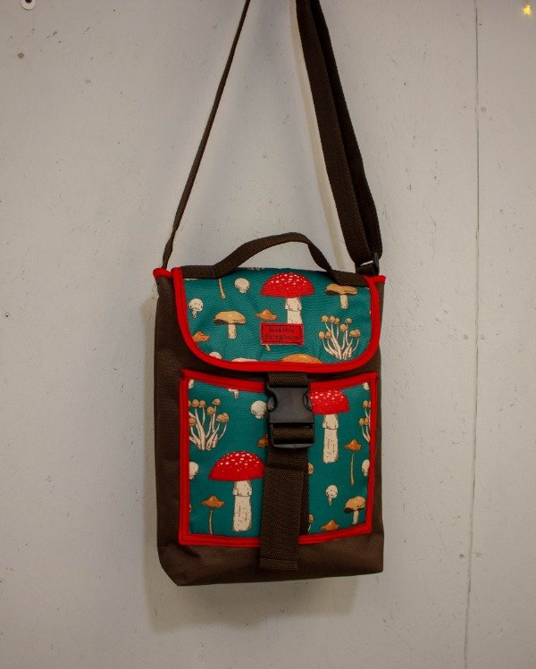 Está hecho con tela cordura resistente, tiene bolsillo frontal, manija y correa regulable.
