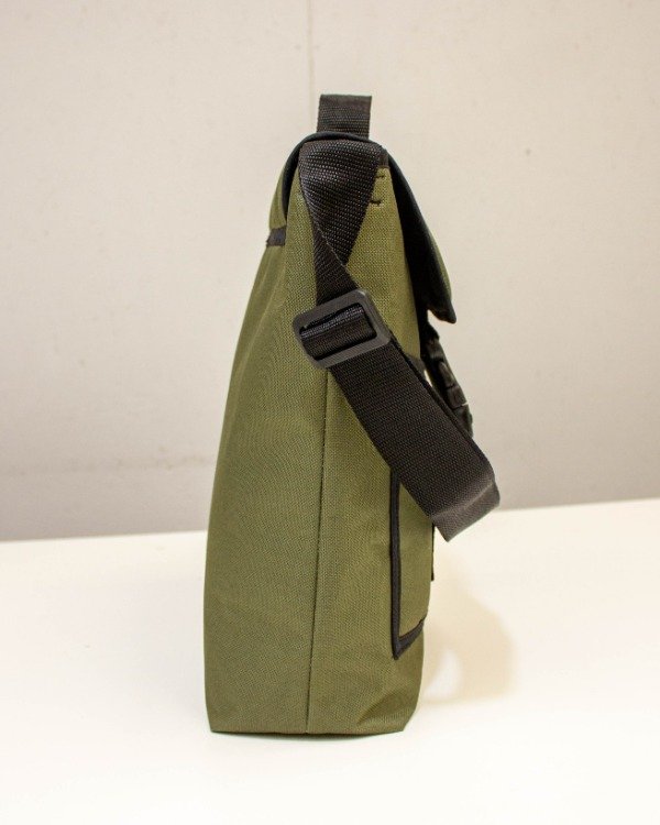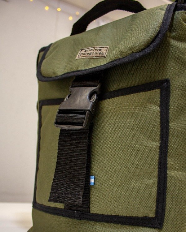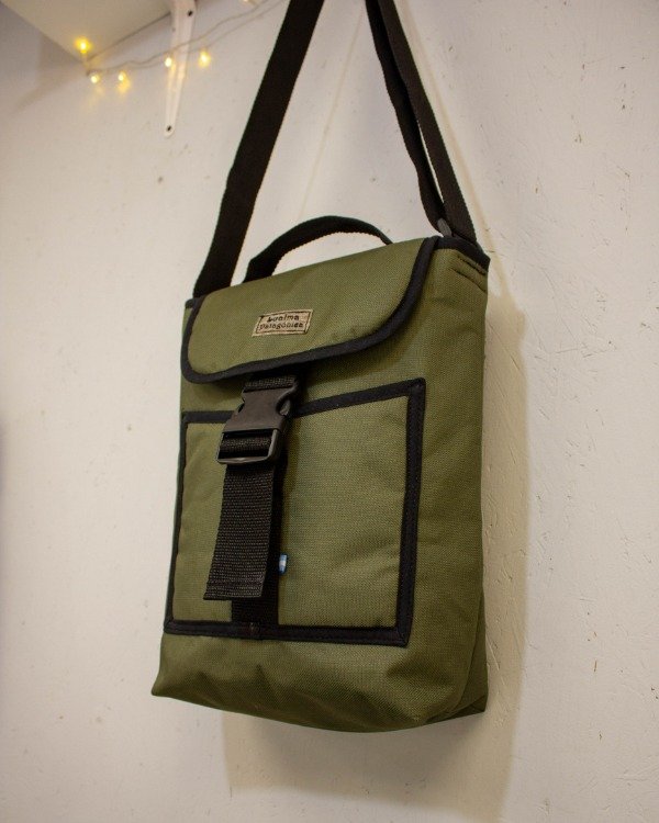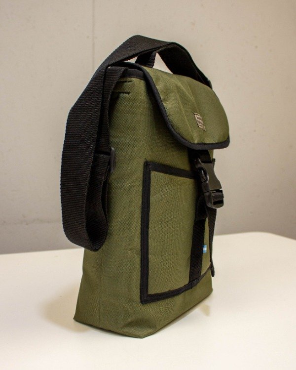 Está hecho con tela cordura resistente, tiene bolsillo frontal, manija y correa regulable.
